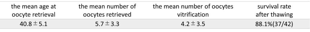 - 採卵時妻平均年齢は40.8±5.1歳、平均採卵数5.7±3.3個、平均卵子凍結数4.2±3.5個、融解後の生存率は88.1%(37/42)でした。