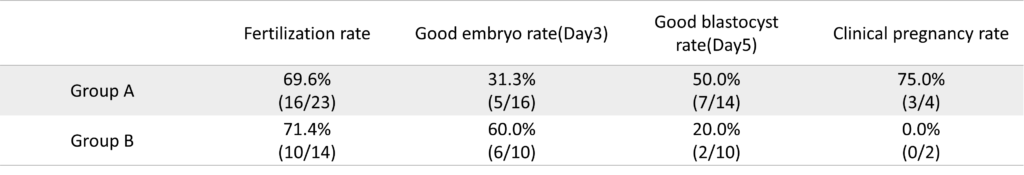 A群、B群のICSI後の正常受精率(69.6%(16/23)、71.4%(10/14))、Day3良好胚率(31.3%(5/16)、60.0%(6/10))、Day5良好胚盤胞率(50.0%(7/14)、20.0%(2/10))、臨床妊娠率(75.0%(3/4)、0.0%(0/2))でした。臨床妊娠が確認された3症例のうち2症例が生産、1症例が妊娠継続中です。児に先天性異常は認めませんでした。